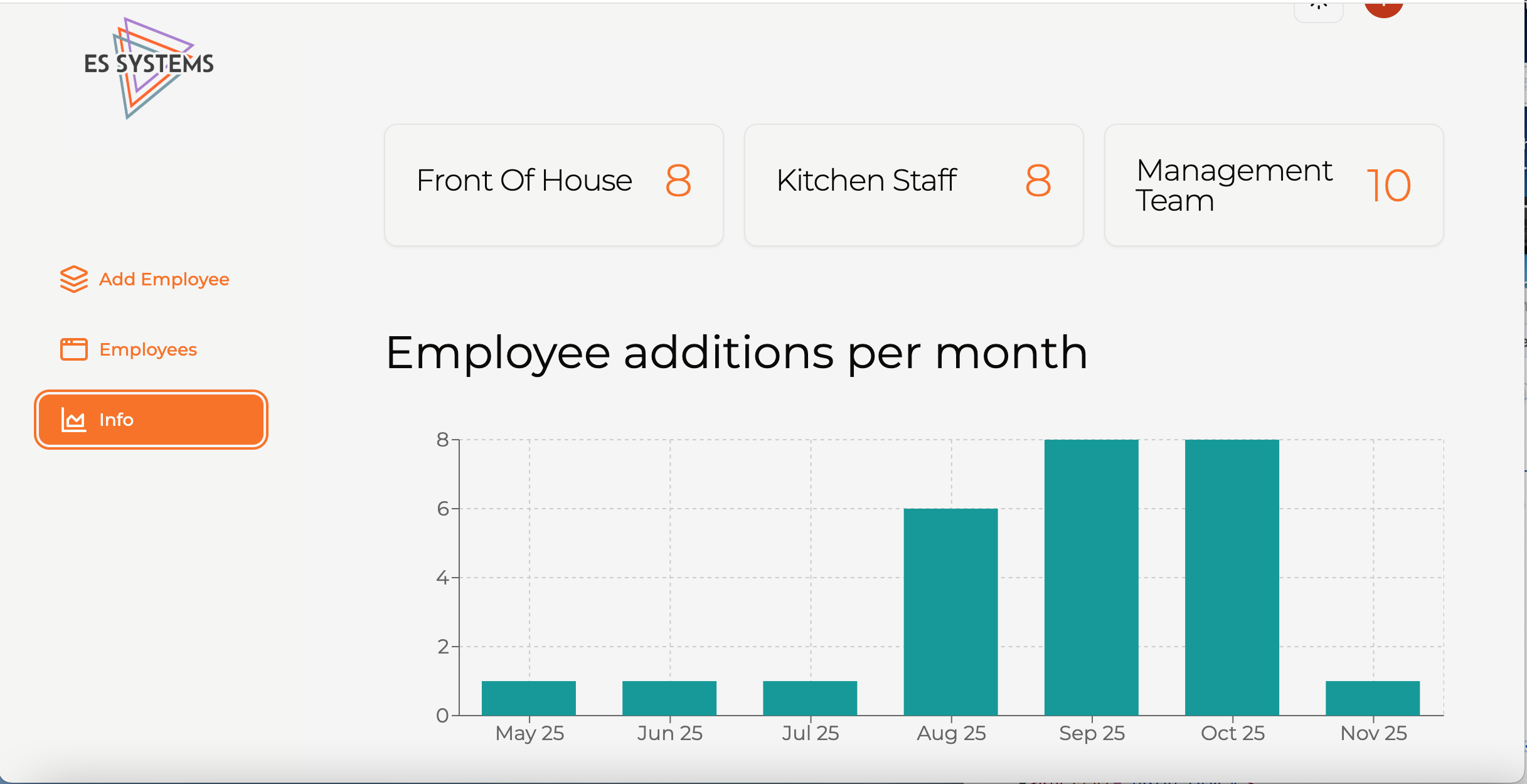 My latest project is called EESystems and it is a hospitality recruitment software built with Next.js, Typescript, and Tailwind CSS. It offers an intuitive interface for managing employee records, tracking new recruits, and viewing key staffing statistics. It provides functionality for individual users or companies, authentication provided by Clerk, and another key feature I'm planning to add is the option for company brunch if the user provides the information.